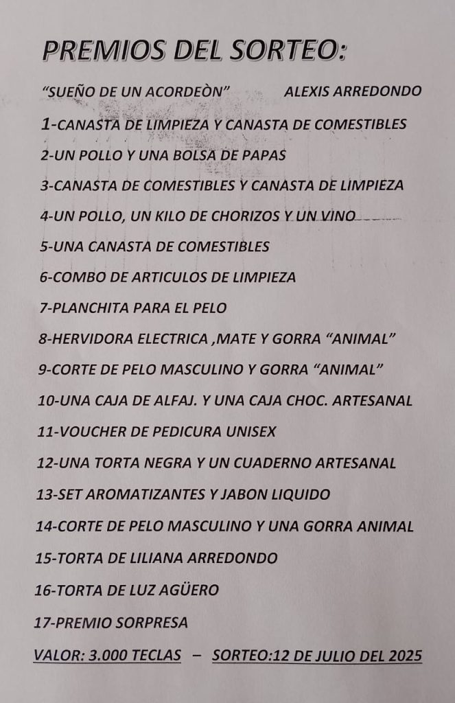 Recientemente, en una conversación con su papá y su mamá, afirmó a El Valle Online que surgió la idea de organizar una rifa para financiar la compra de un acordeón. Con entusiasmo, Alexis tomó la iniciativa y sus familiares comenzaron a colaborar. Los números están disponibles en efectivo o por Mercado Pago a través de alexisacordeon.mp, con un valor de 3,000 teclas. El sorteo ese realizará el próximo 12 de julio y ofrece 16 premios que incluyen canastas comestibles y de limpieza, cortes de pelo, cajas de alfajores, chocolates y torta negra, entre otras sorpresas. Mas información al celular 280 403-8925.