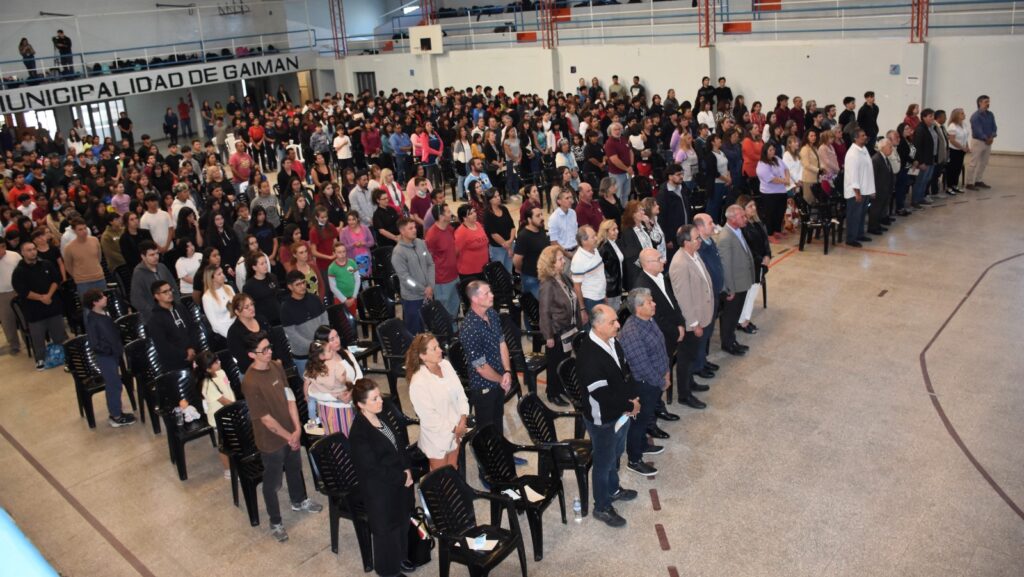 La comunidad educativa se reunió en el gimnasio municipal de Gaiman para conmemorar dos décadas de dedicación a la educación y el desarrollo local.