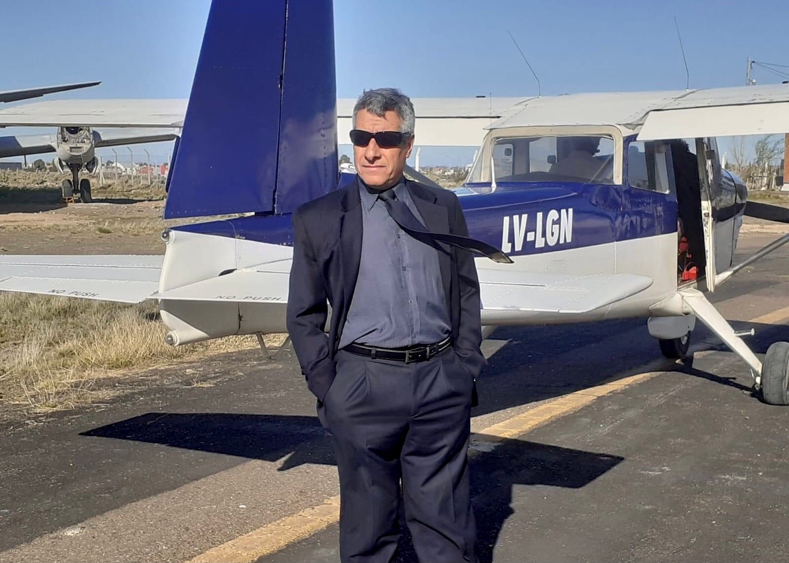 Raúl Assin participando del rodaje que se realizó en el aeroclub de Trelew