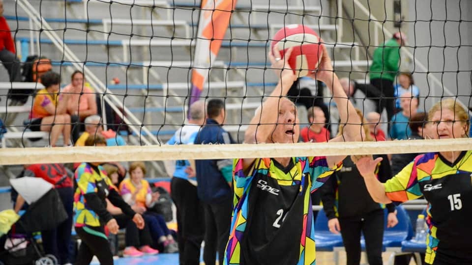 El “Newcom” es una adaptación del vóleibol para adultos mayores, donde la pelota no se golpea, sino que se atrapa y se lanza por arriba de la red.