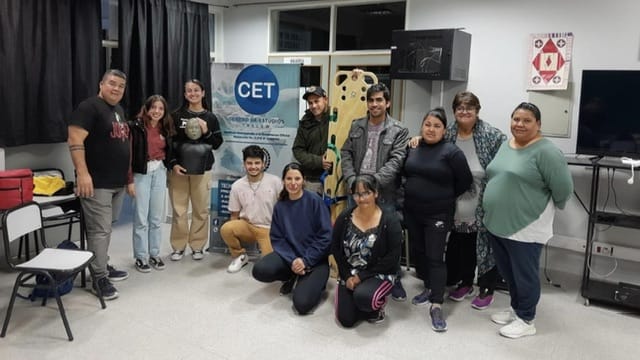 El profesor Fabián Maldonado, junto con las alumnas Micaela Saldaña y Margatet Piñanez del Centro de Estudios Trelew (CET), llevaron a cabo un curso de Reanimación Cardiopulmonar (RCP) dirigido a los estudiantes de primer año de la escuela provincial 761 de Gaiman.