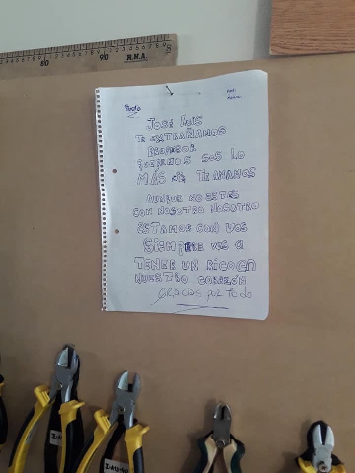 Tal es así que el dolor por la pérdida del docente se refleja en el taller de la Escuela nº 781 Don Eladio Zamarreño de Dolavon donde José Luis solía instruir a los estudiantes sobre la materia electricidad.
