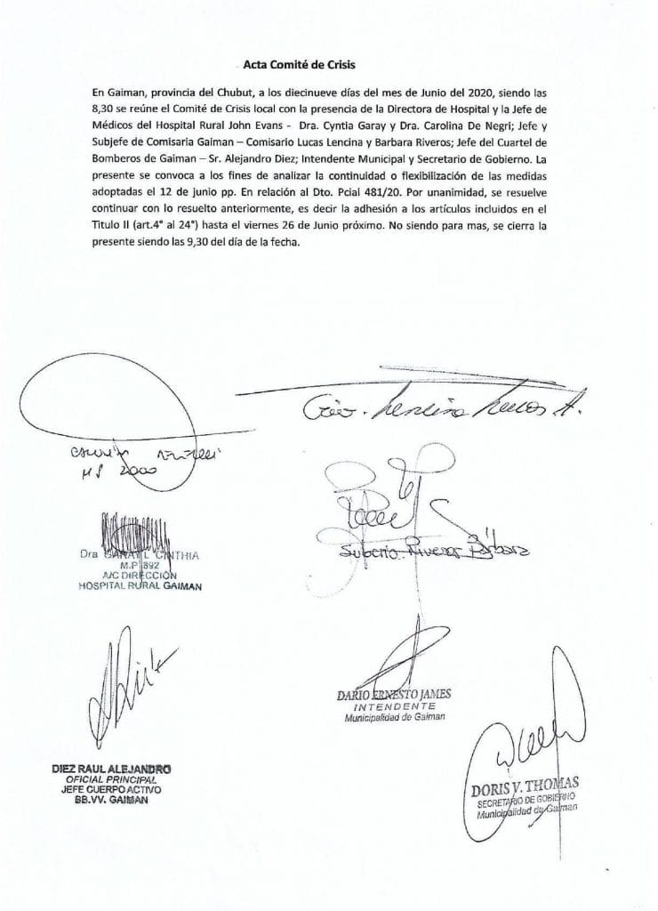 El Comité de Crisis de Gaiman resolvió continuar, hasta el próximo viernes 26 de junio, con la adhesión al decreto provincial 481 por el cual se determinó aplicar la medida de Aislamiento Social, Preventivo y Obligatorio para Trelew, Rawson y Puerto Madryn, con el fin de evitar la propagación del Coronavirus (Covid19).