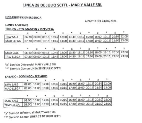 A partir del 24 de julio la empresa de transportes de pasajeros de las líneas 28 de Julio y Mar y Valle informó la modificación de horarios entre Trelew y Puerto Madryn.