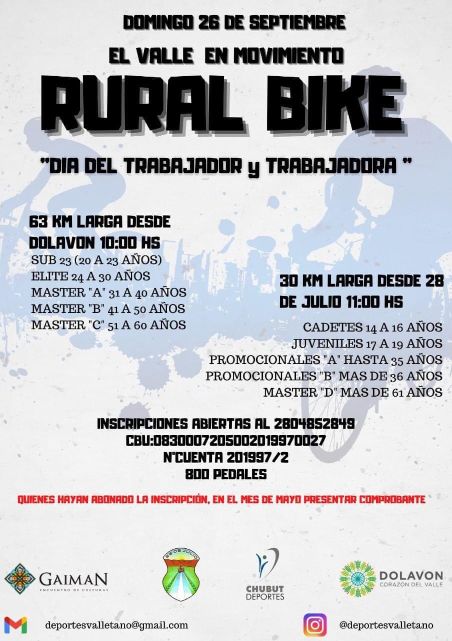 El 26 de septiembre se realizará el Rural Bike por el “Día del Trabajador y Trabajadora” organizado por las direcciones de deportes de Gaiman, Dolavon y 28 de Julio, y el apoyo de Chubut Deportes.