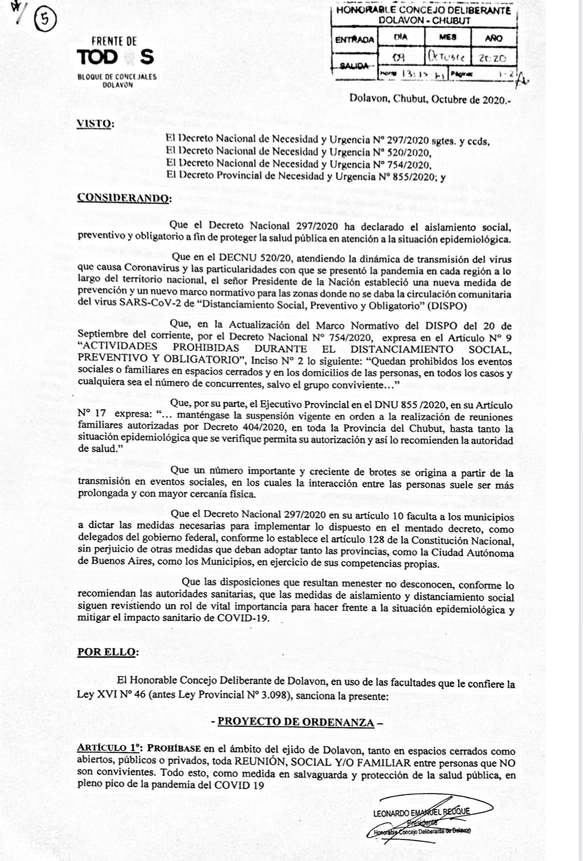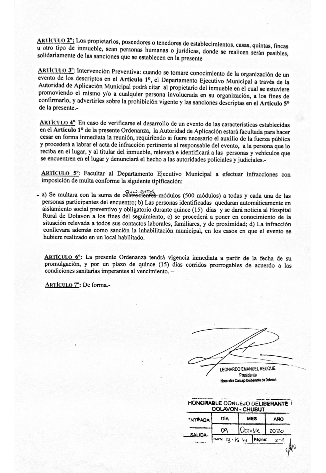 Este jueves en el Honorable Concejo Deliberante de Dolavon aprobó la ordenanza que establece una multa de 3.700 pesos para las personas que participen de reuniones familiares o sociales.