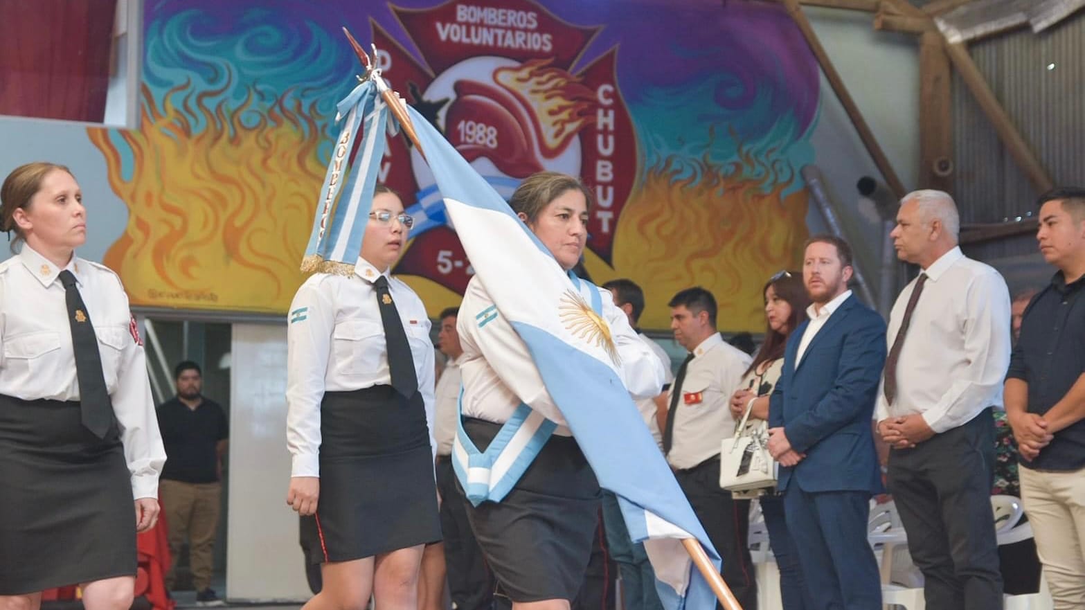 También estuvieron presentes el intendente Dante Bowen, el presidente del Concejo Deliberante, Leonardo Reuque, el representante de la filial Chubut de Scouts de Argentina, Rubén Cifuentes y los jefes del cuartel de Dolavon y Gaiman, entre otros.