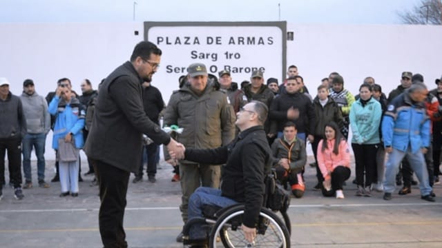 El suboficial Mayor Gildo Emilio Amilcar Zampa, sobreviviente de la tragedia vial ocurrida en la Ruta Nacional 3 en el año 2012, recibió un reconocimiento en la plaza de armas de la sede de la Decimocuarta Agrupación Chubut de la Gendarmería Nacional.