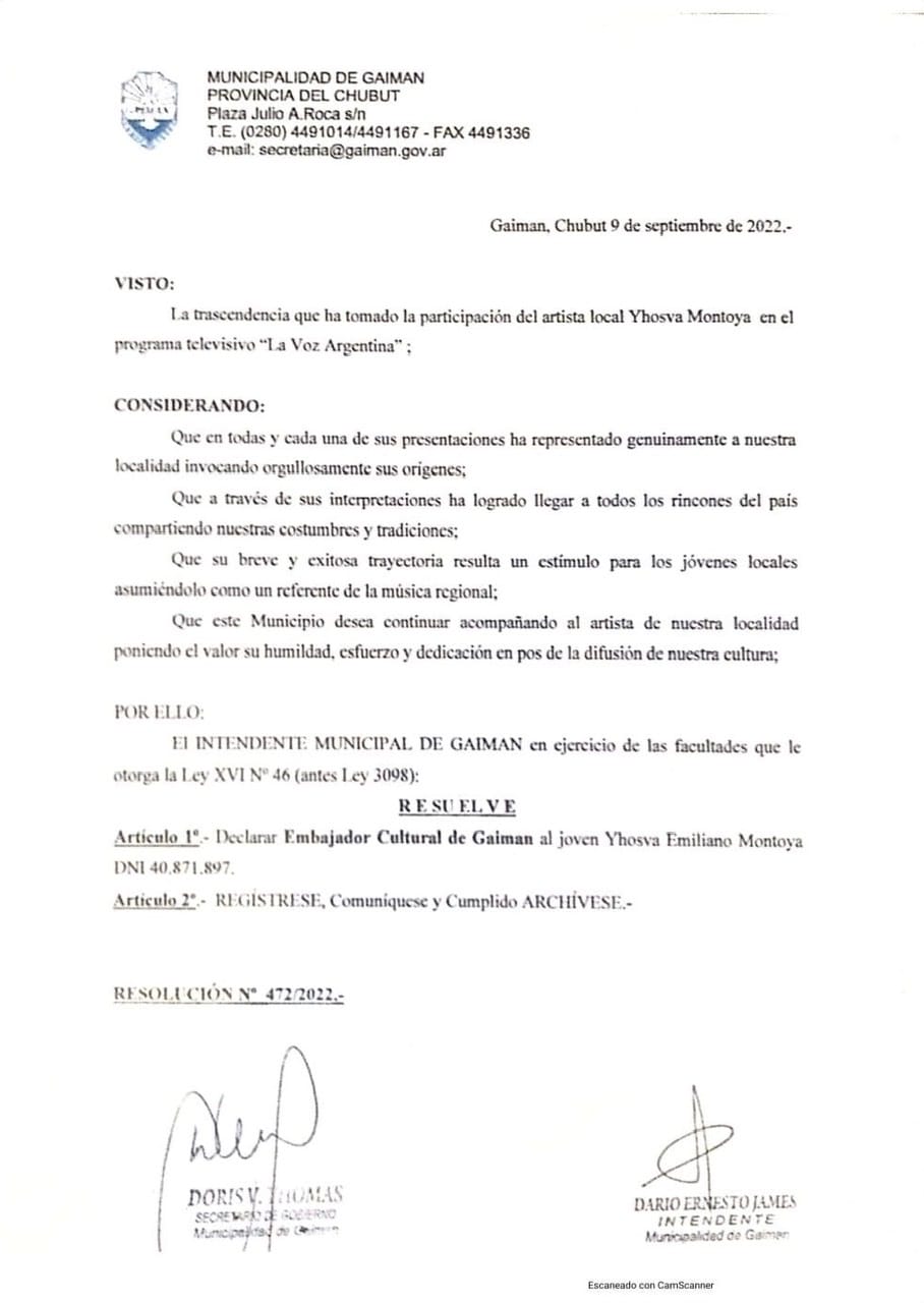 El Intendente Darío James declaró Embajador Cultural al artista Yhosva Montoya. Fue “visto la trascendencia que ha tomado la participación del artista local en el programa televisivo La Voz Argentina” señaló a través de la resolución 482/2022 que también lleva la firma de la Secretaria de Gobierno, Doris Thomas.