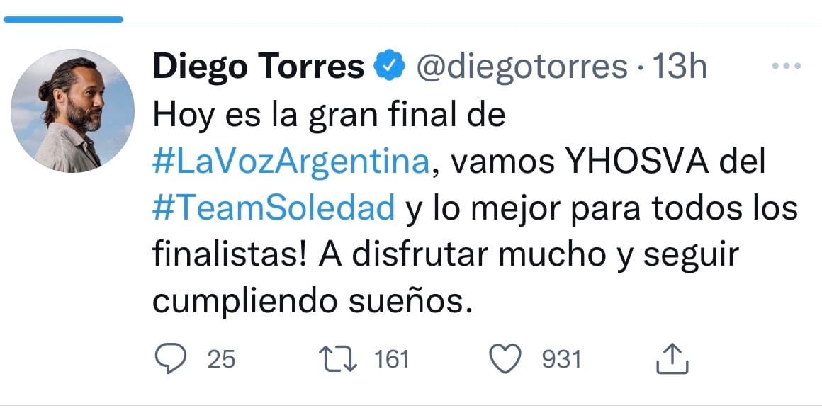 A través de su Twitter el actor, cantautor y músico argentino compartió un mensaje en el marco de las instancias finales del exitoso reality de Telefé. En la publicación escribió: “Vamos Yhosva del #TeamSoledad y lo mejor para todos los finalistas”.